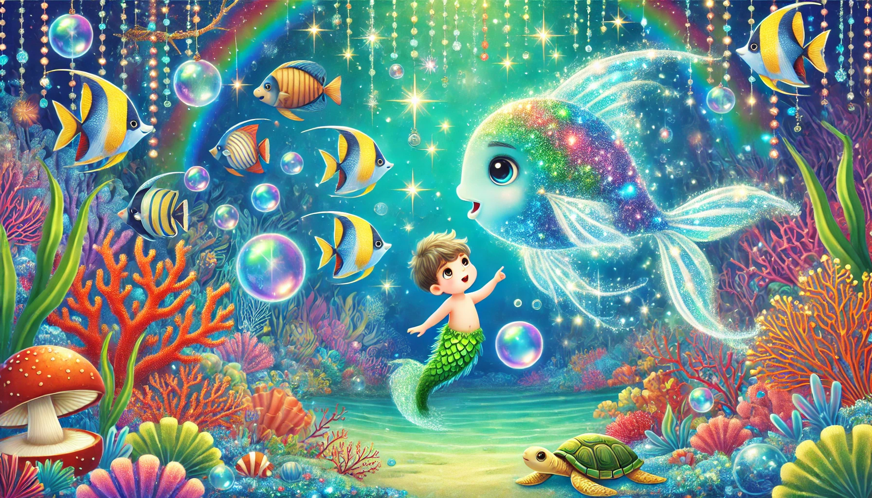 깊고 푸른 바닷속, 소원의 바다에는 신비한 물고기 한 마리가 살고 있었어요. 그 물고기의 이름은 피시였어요. 피시는 다른 물고기들과 다르게 사람의 말을 할 수 있는 능력이 있었어요!